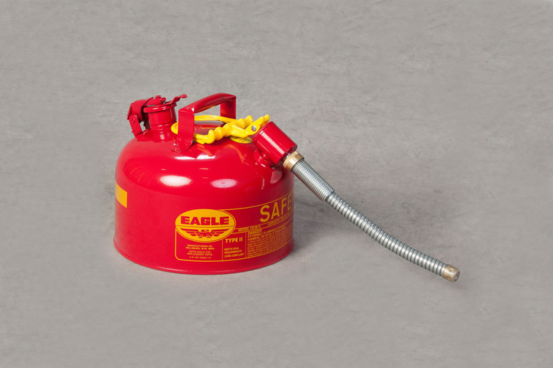 O container de segurança tipo II de 2,5 galões da Eagle (U226S) possui duas aberturas, uma com tampa de fechamento de mola de alívio de pressão para o enchimento, outra com válvula de vazamento acionada com bico de metal flexível para vazão controlada e segura. O bico de preenchimento e os supressores de chamas nas duas aberturas são de latão “antifaisca”, projetado para proteção contra recuo.